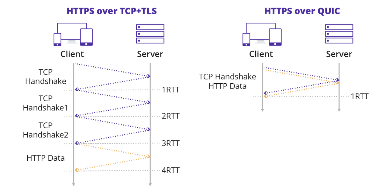 최신 버전의 TLS 프로토콜 채택인 TLS 1.3은 클라이언트가 TLS 핸드셰이크가 완료되기 전에 애플리케이션 데이터를 보낼 수 있도록 하여 1-RTT 및 0-RTT를 모두 지원한다. QUIC 프로토콜을 사용하면 첫 번째 핸드셰이크 협상에 1-RTT가 걸리지만 이전에 연결된 클라이언트는 캐시된 정보를 사용하여 0-1 RTT만으로 TLS 연결을 복원할 수 있다.