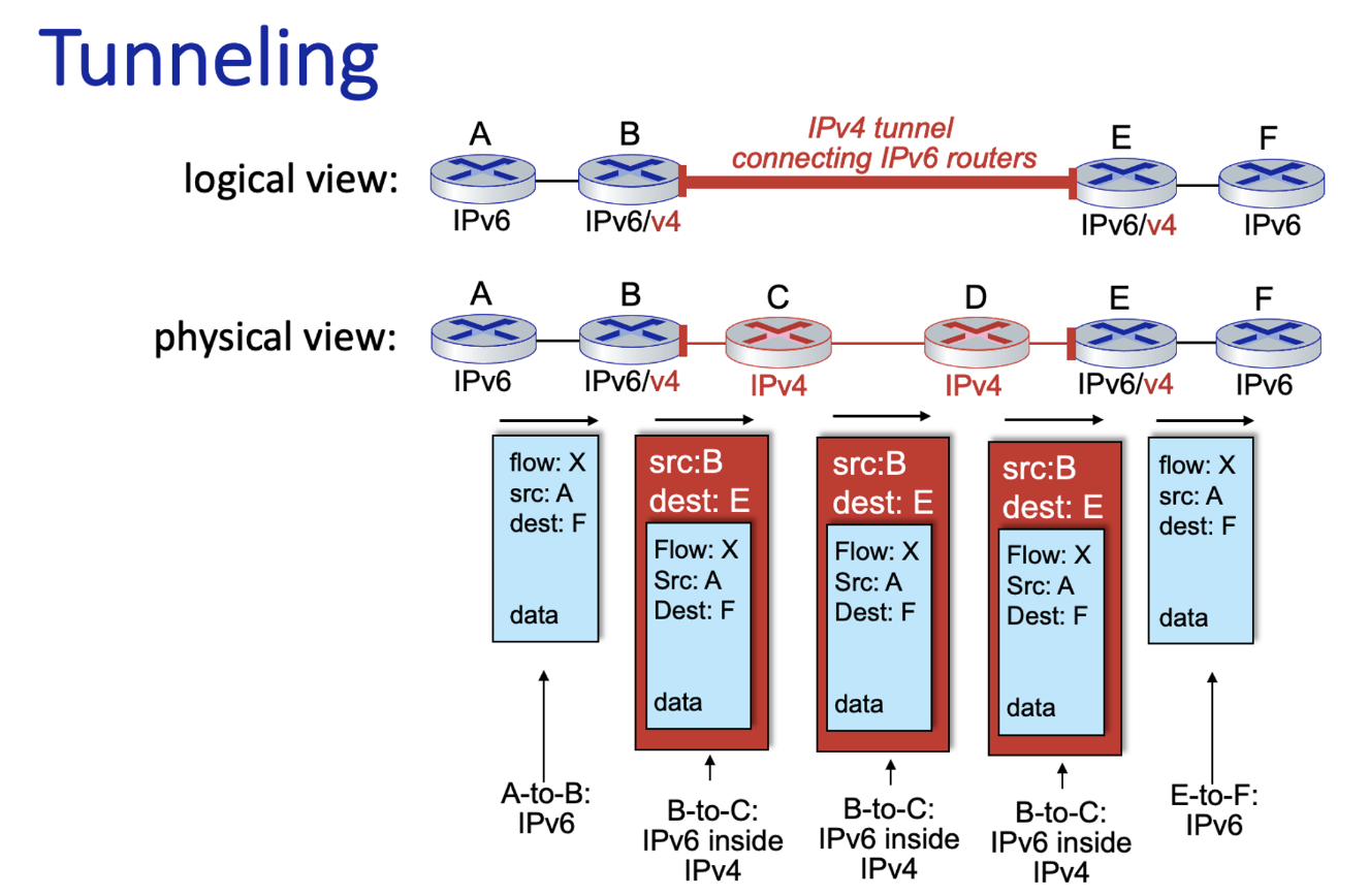 - IPv4를 사용하는 장비(C)를 만나면 IPv4의 데이터 필드에 IPv6의 정보를 넣는다.