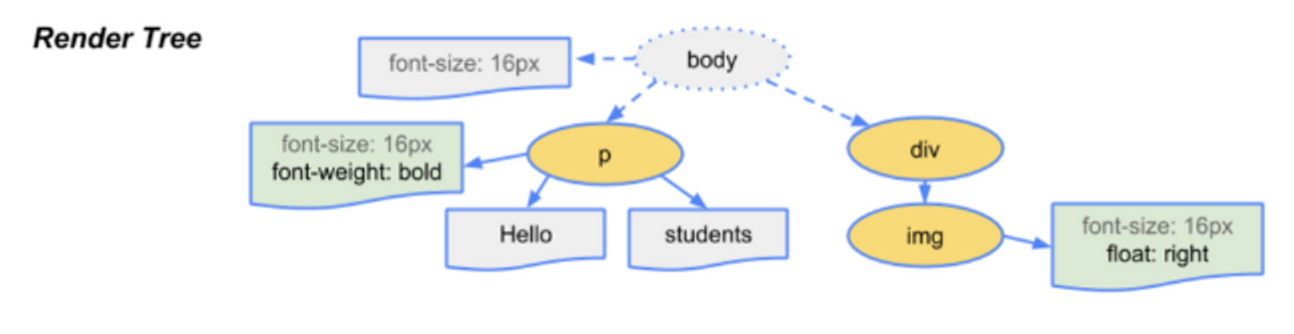 - 1, 2단계에서 생성된 DOM Tree와 CSSOM Tree를 매칭시켜 Render Tree를 구성한다.