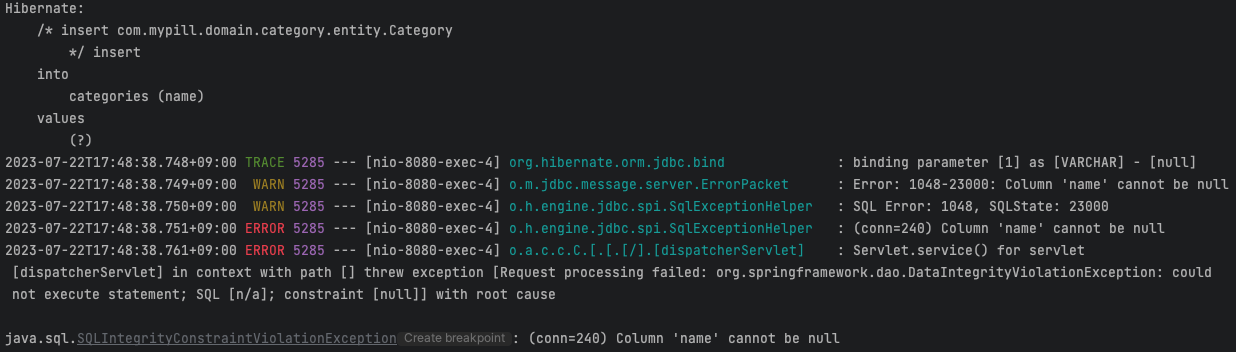 - 이후 SQLIntegrityConstraintViolationException 이 발생한 것을 확인할 수 있다.