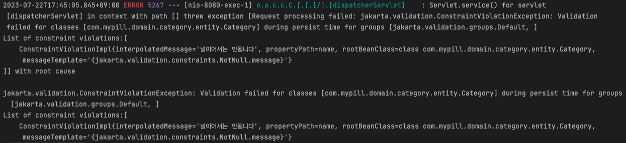 - jakarta.validation.ConstraintViolationException이 발생한 것을 확인할 수 있다.
