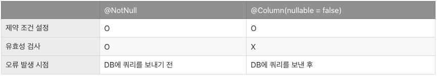 전체 리팩토링 과정에서 살펴보니 @NotNull 과 @Column(nullable = false) 를 혼용해서 사용하고 있었다.