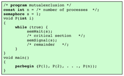 - S(세마포어 변수), n (공유자원에 접근가능한 프로세스 수)를 사용한다.