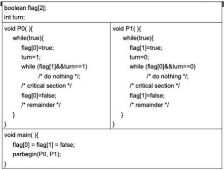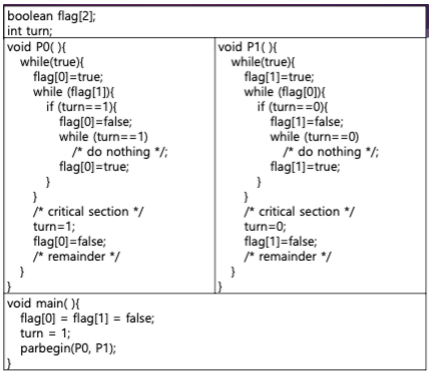 - turn : 임계 영역에 들어가는 순서로, 0 또는 1의 값을 갖는다. 0인 경우엔 P0의 순서, 1인 경우엔 P1의 순서이다.