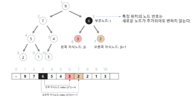 - 오른쪽 자식의 인덱스 = (부모의 인덱스) * 2 + 1