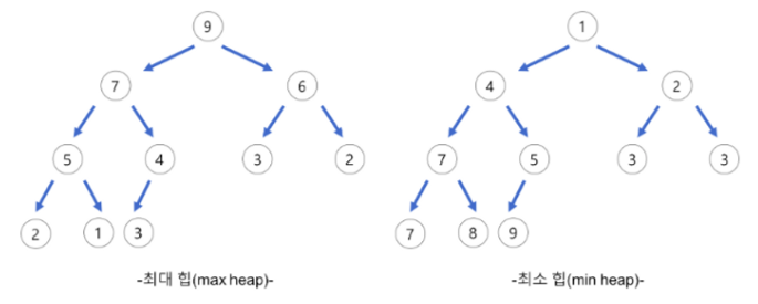 - 부모 노드가 자식 노드보다 크거나 같은 완전 이진 트리