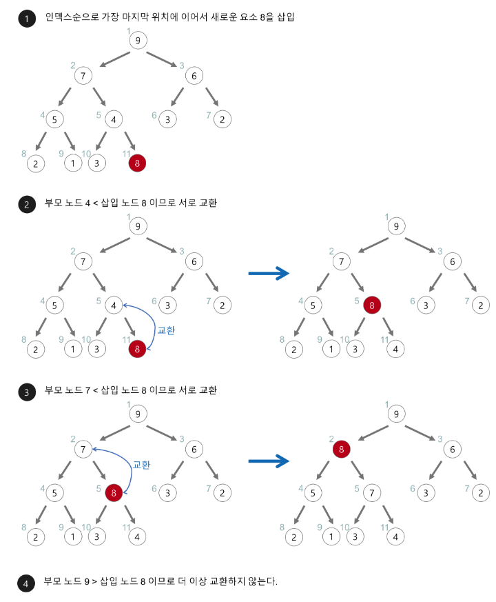 - 새로운 노드와 부모 노드가 최대힙/최소힙 성질을 만족하지 않는다면 교체한다.