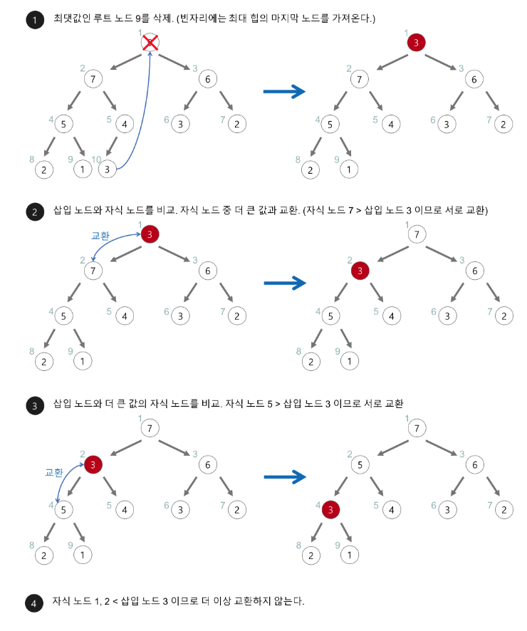 - 자식 노드 중 더 큰 값(최소힙이라면 더 작은 값)과 교체한다.