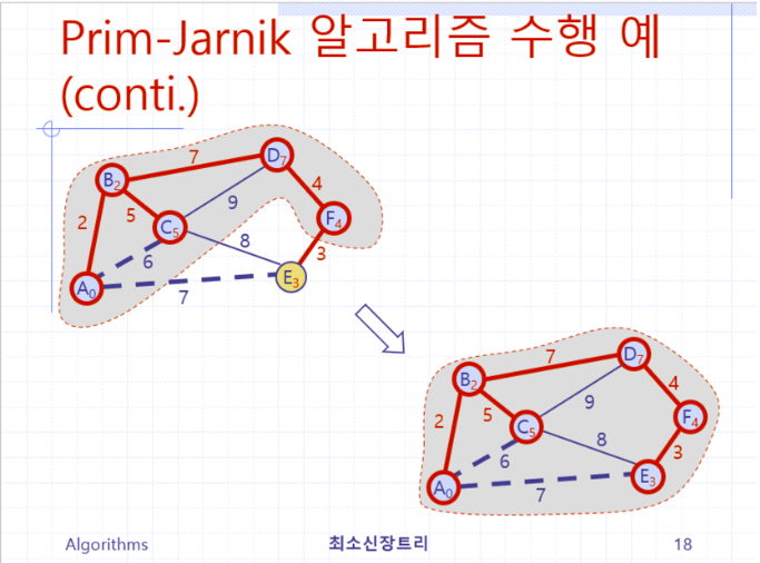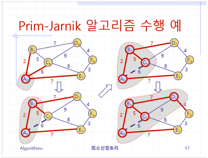 시작 정점에서 출발하여 신장트리 집합을 단계적으로 확장해 나가는 방법이다.