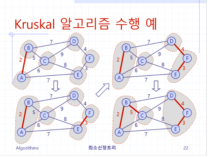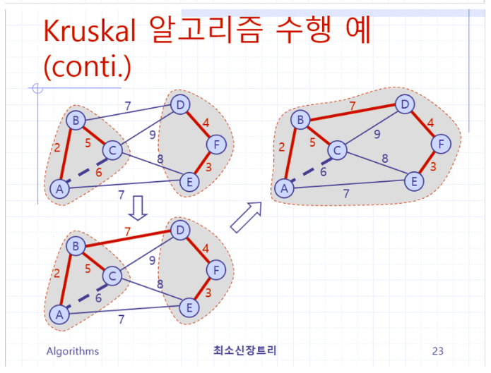 - 가장 작은 가중치의 간선 선택(사이클이 만들어지지 않도록)